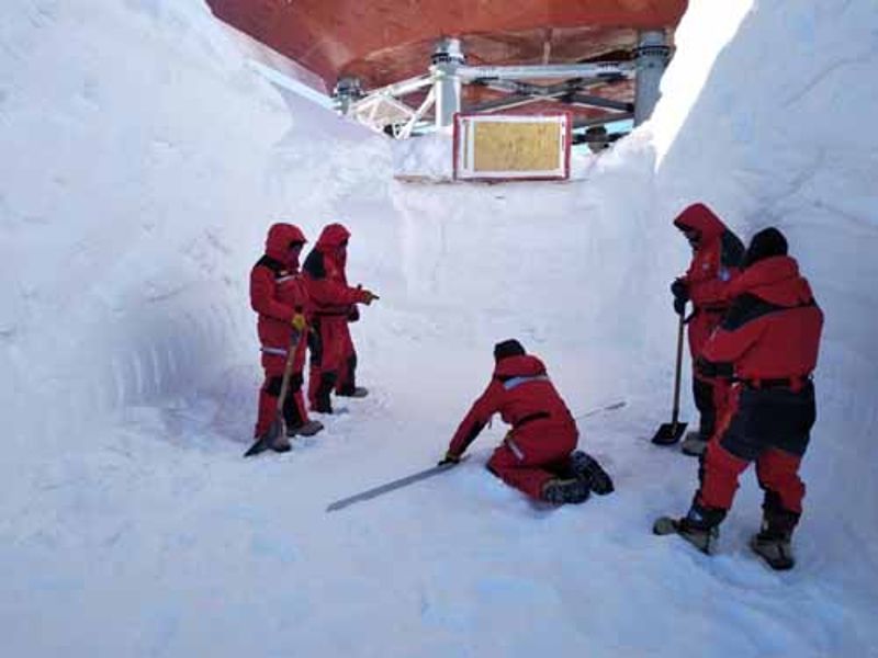 正如中國第35次南極科考泰山隊隊長姚旭所說,“這里盛行暴風雪,一次暴風雪就可以埋掉挖好的基坑,因此我們趁著剛來時的好天氣,讓所有隊員都參與了主體建筑下部基坑的開挖,其他部分使用揚雪機,挖出了一個面積約300平方米、深5米的基坑,為二期工程的完成開了個好頭。”